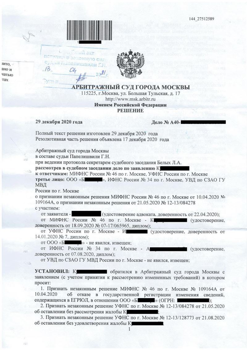 Разработана правовая позиция, согласно которой налоговый орган не имел основания для отказа в смене ликвидатора, подана обязательная досудебная жалоба в вышестоящий налоговый орган, а затем подготовлено и подано заявление в арбитражный суд о признании оспариваемого решения незаконным и обязании налогового органа сменить ликвидатора, также принято участие во всех судебных заседаниях.