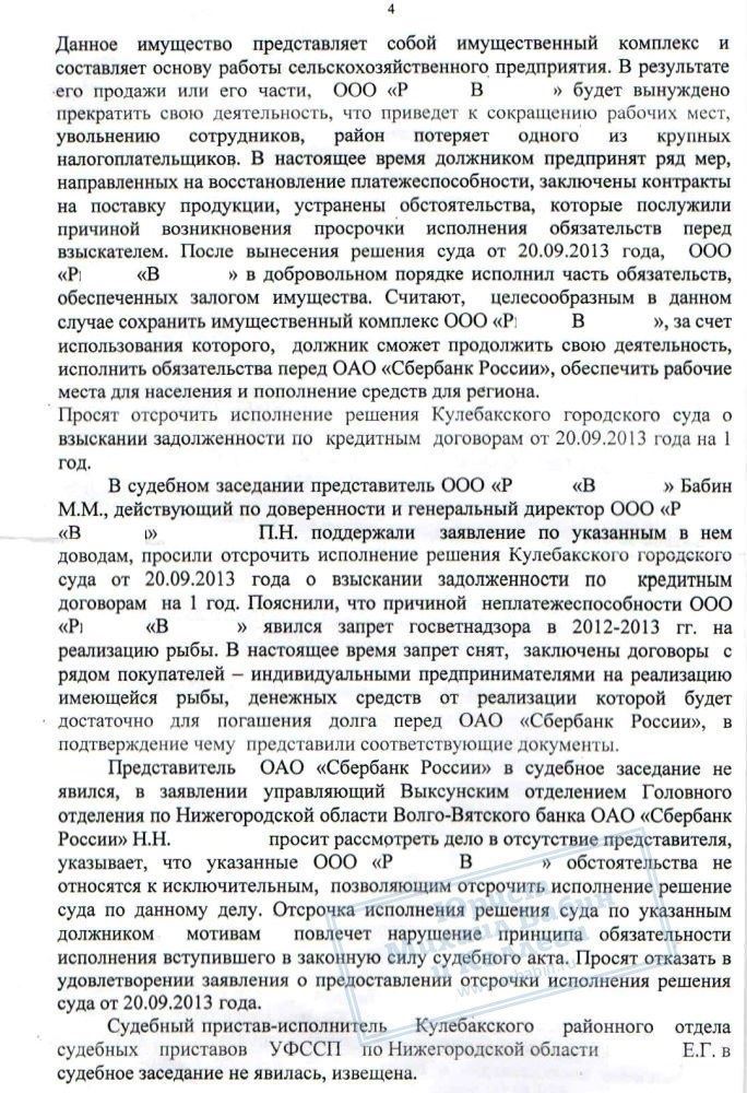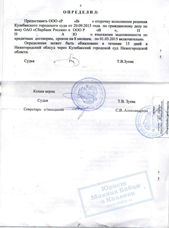 • Кулебакский городской суд предоставил ООО «Р.В.» отсрочку исполнения решения о взыскании задолженности сроком на 8 месяцев.