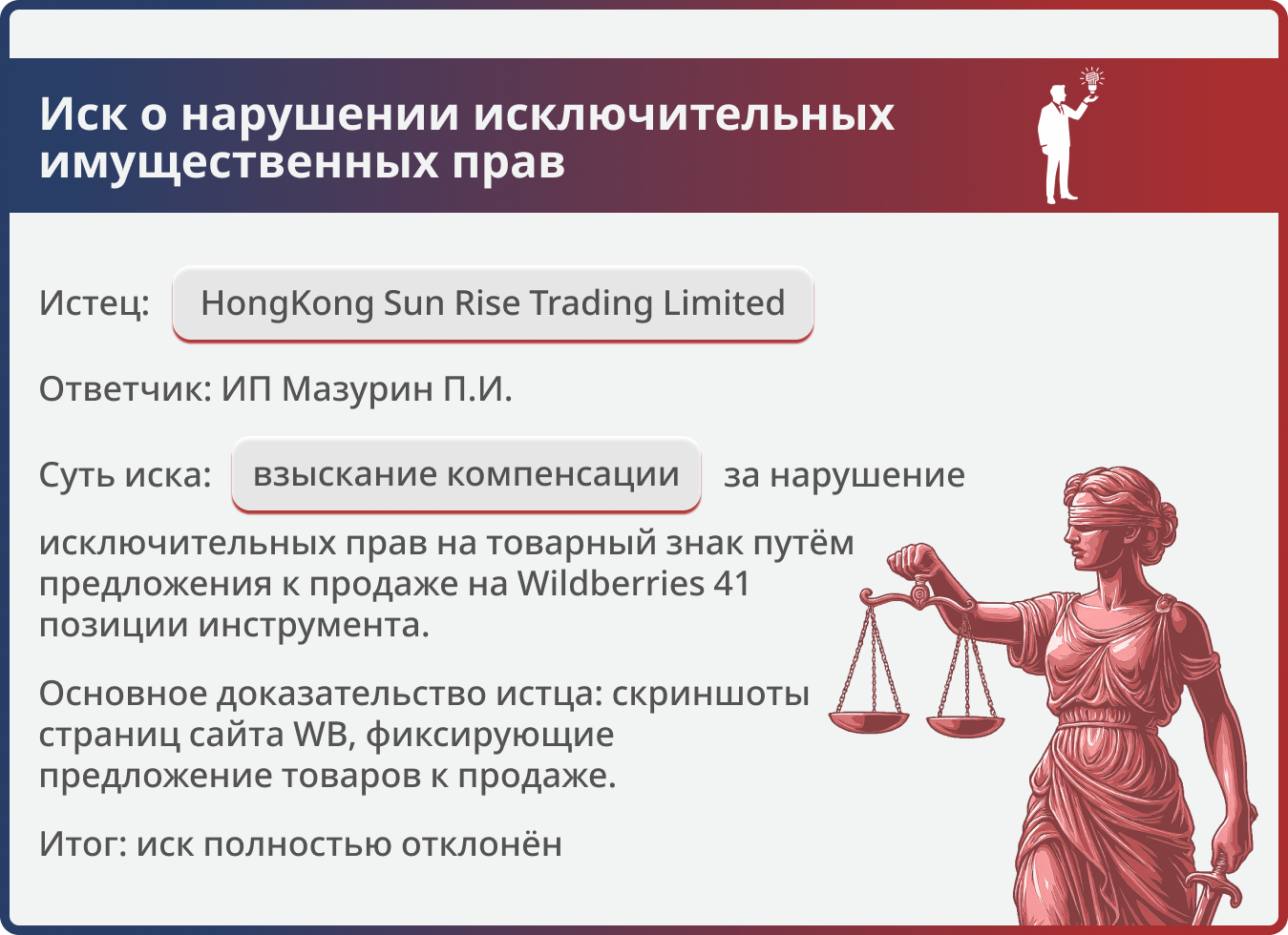 Защита была построена на принципе исчерпания исключительного права (статья 1487 ГК РФ). Мы представили суду неопровержимые доказательства того, что спорный товар введён в гражданский оборот на территории России с согласия самого правообладателя: