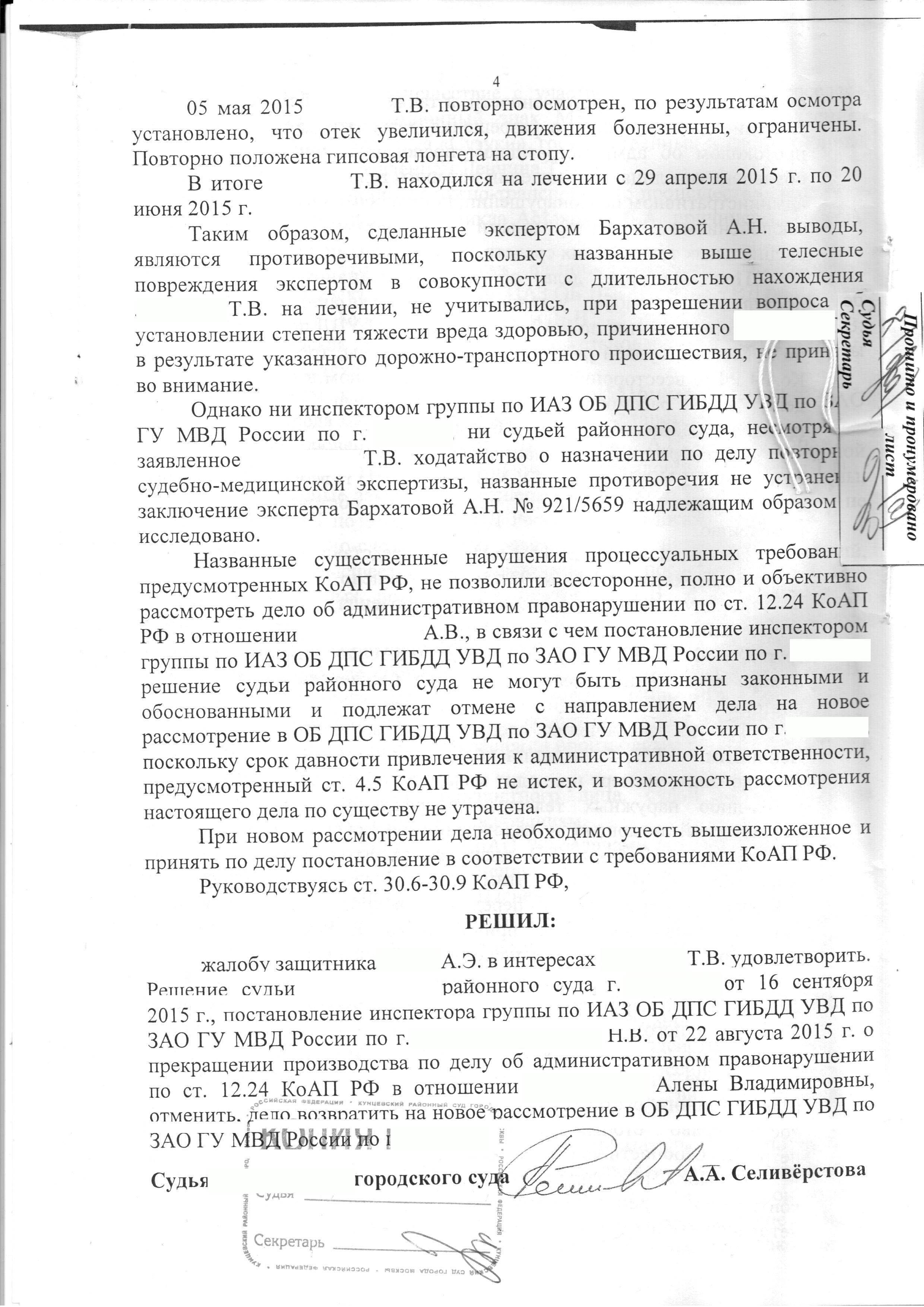 Судья, изучив материалы дела, доводы поданной жалобы, приняла решение об отмене вердикта суда и постановления инспектора группы по ИАЗ ОБ ДПС ГИБДД УВД. Таким образом, поданная жалоба была удовлетворена в полной мере. В то же время, согласно данному решению, дело об административном правонарушении возвращено на новое рассмотрение с учетом выявленных обстоятельств.