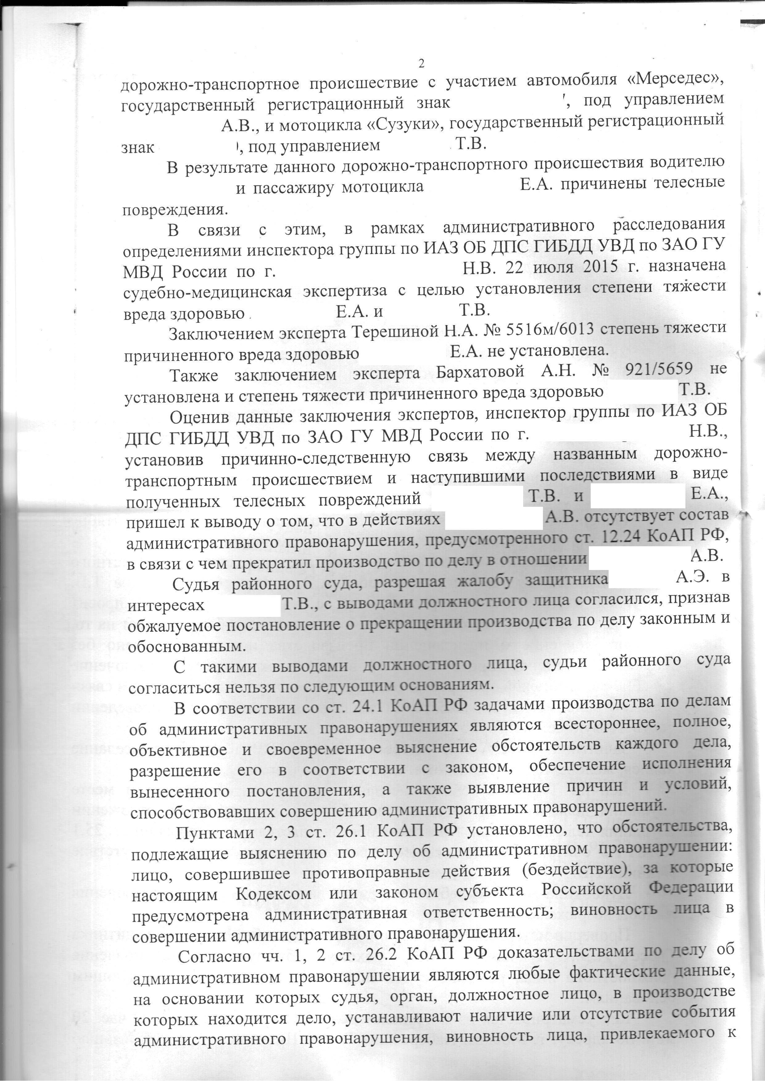 Согласно поданным материалам дела, 28 апреля 2015 года произошло ДТП при участии автомобиля «Мерседес» и мотоцикла «Сузуки», в результате которого водителю и пассажиру мотоцикла были причинены телесные повреждения.