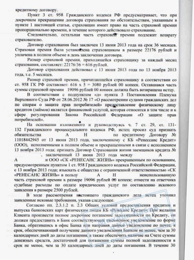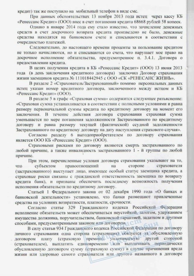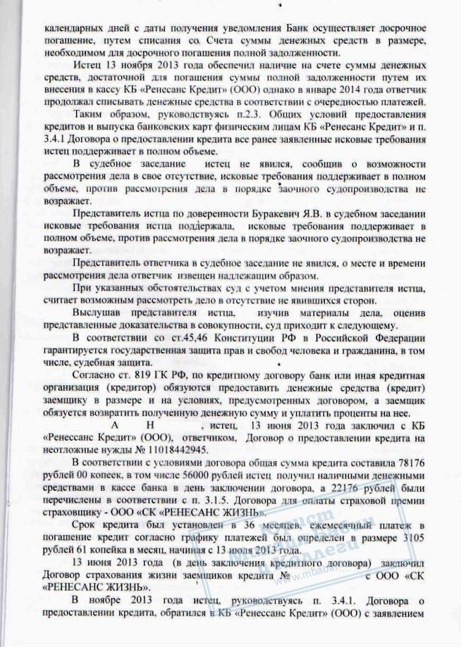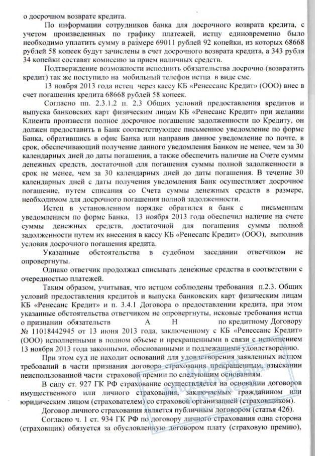 Зимой 2014 года к нам обратился К. Досрочно заплатив кредит в КБ "РЕНЕССАНС", он столкнулся с тем, что банк продолжал просто списывать ежемесячные платежи с внесённой суммы. Как только сумма была списана, банк стал требовать деньги снова, не согласившись с досрочным погашением кредита.