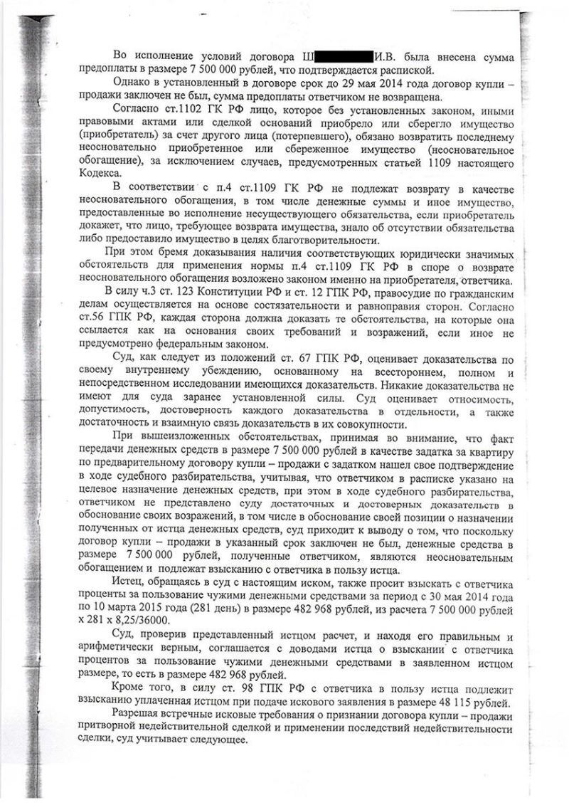 В 2014 году клиент Ш. заключила предварительный договор на покупку квартиры и оплатила продавцу 7 500 000 руб., однако, продавец отказался заключать основной договор и передавать квартиру, а полученные деньги не вернул.