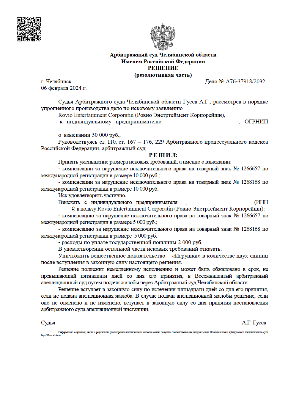 К нам за помощью обратился индивидуальный предприниматель, против которого был подан иск от компании Rovio Entertainment Corporation о взыскании 50 000 рублей в качестве компенсации за нарушение прав на два товарных знака. Задачей нашей команды была не просто формальная защита, а активная работа по минимизации убытков клиента в ситуации, когда факт спора рассматривался в упрощенном порядке.
