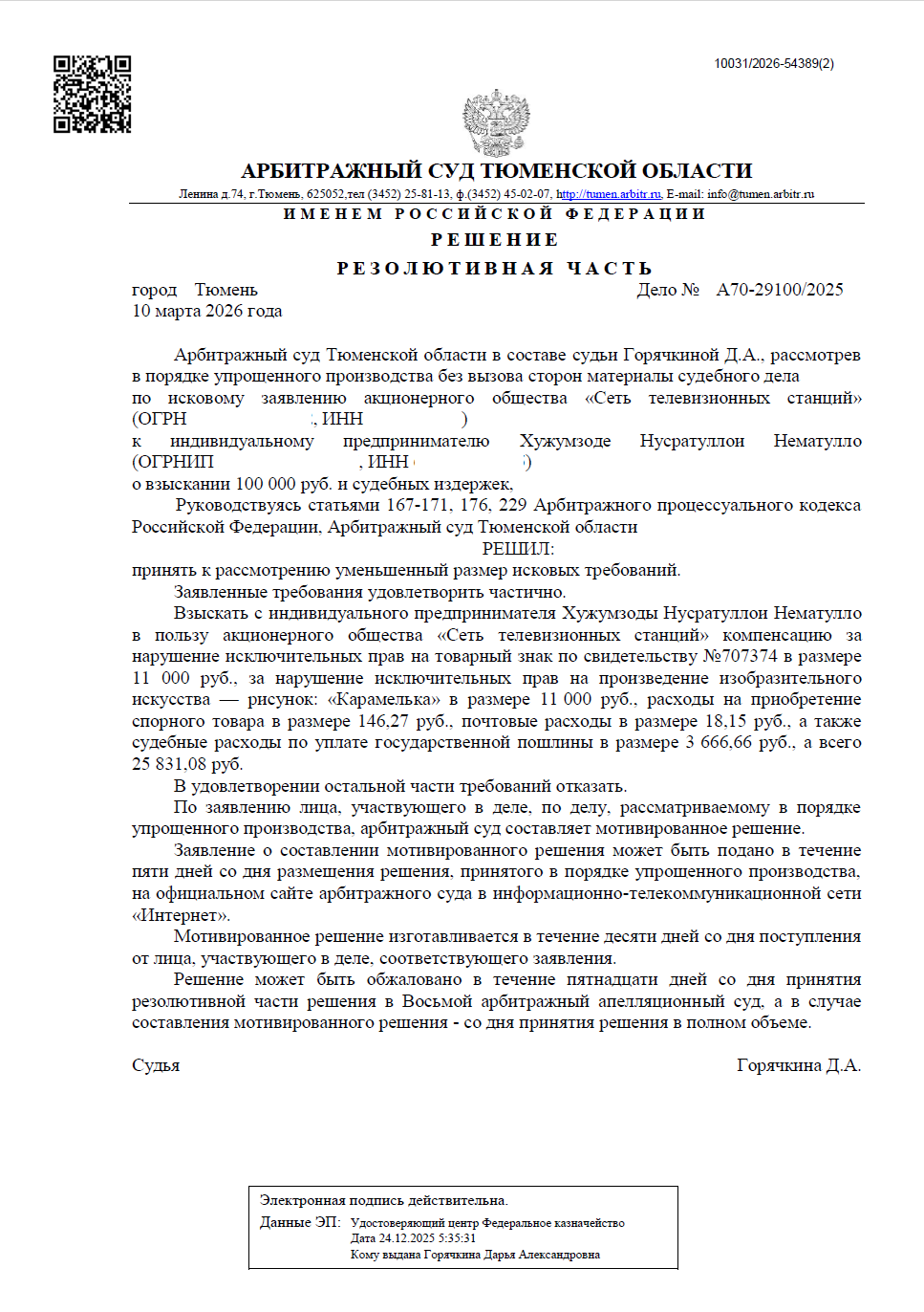 Истец (АО «Сеть телевизионных станций») обратился в суд с иском к ИП о взыскании 100 000 руб. компенсации за нарушение исключительных прав на товарный знак и произведение изобразительного искусства — рисунок «Карамелька» (персонаж анимационного сериала). В ходе рассмотрения дела в порядке упрощённого производства истец, ознакомившись с позицией ответчика, самостоятельно уменьшил размер исковых требований. Суд принял уточнение и рассмотрел дело по существу.