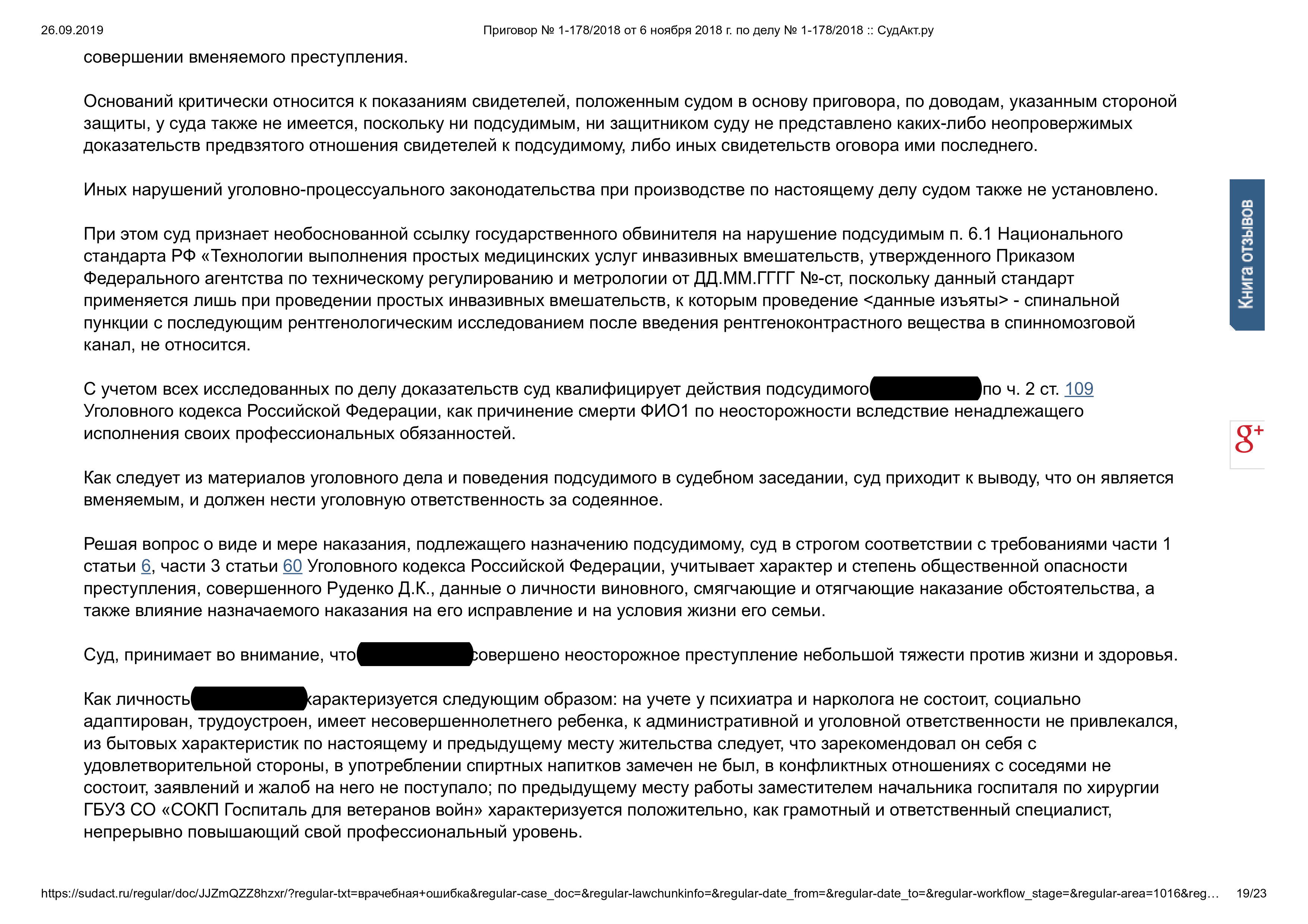 Суд признал врача виновным по ч. 2 ст. 109 УК РФ (причинение смерти по неосторожности). Назначено наказание: ограничение свободы и лишение права заниматься врачебной деятельностью на 1 год.