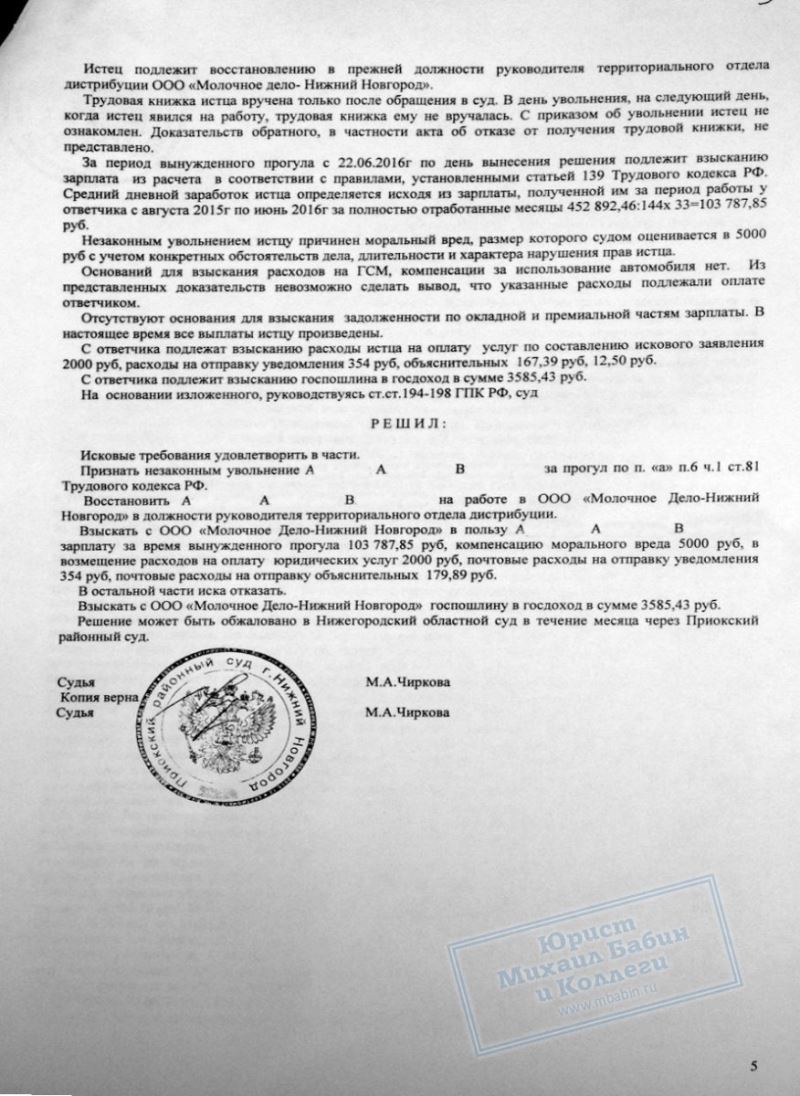 Юрист помог доказать незаконность увольнения сотрудника ООО "МД НН", восстановить его на прежнем месте работы и взыскать компенсацию за вынужденный прогул.