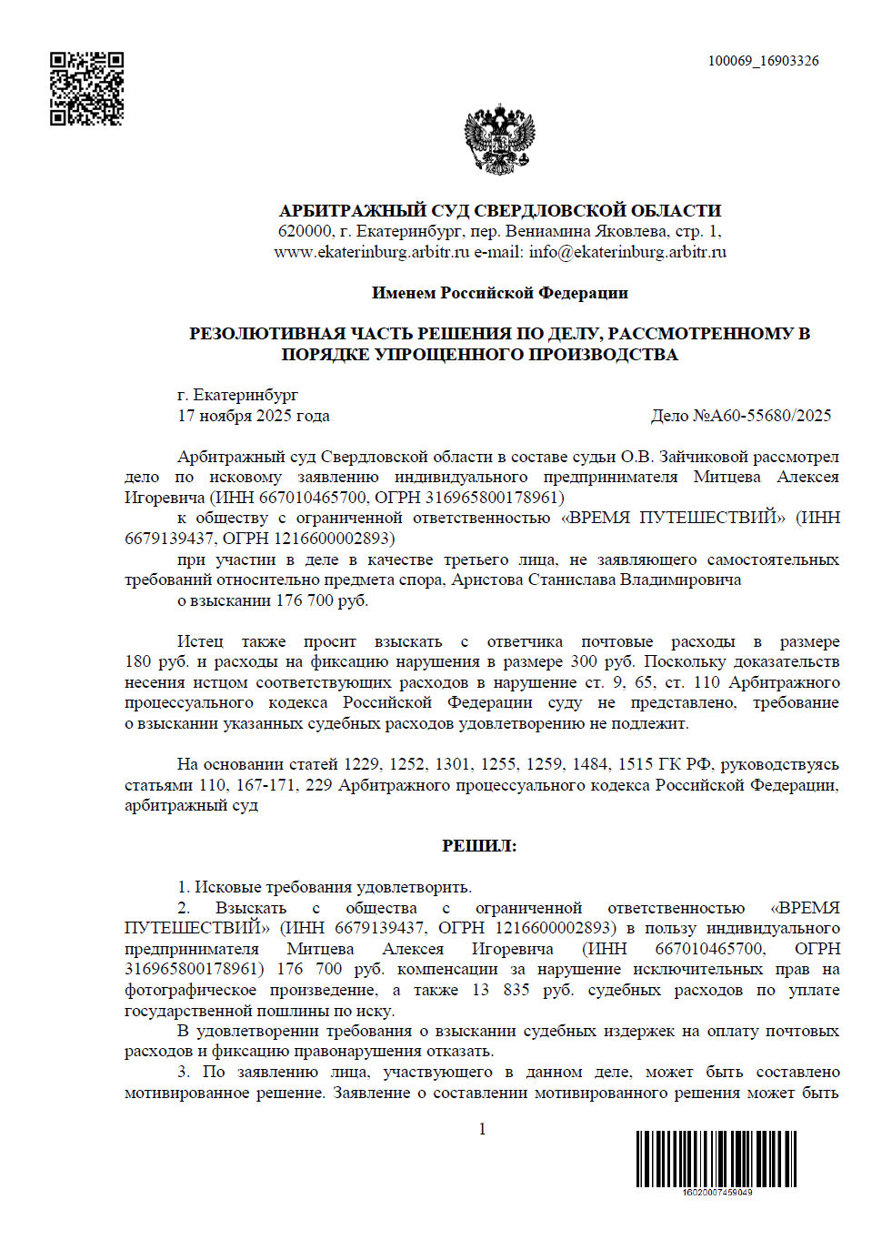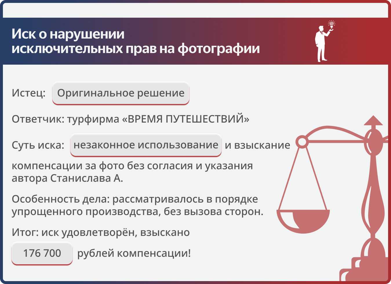 Туристическая компания «ВРЕМЯ ПУТЕШЕСТВИЙ» использовала фотографии Станислава Аристова без разрешения. Мы подали иск с точным расчетом компенсации. Суд полностью удовлетворил наши основные требования, взыскав более 190 000 рублей с учетом госпошлины.