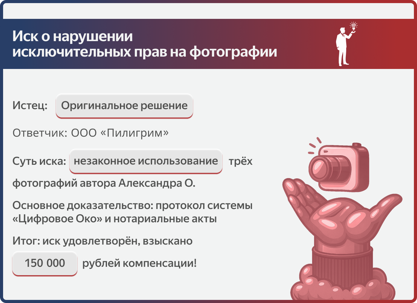 - Ответчик заявил, что узнал о нарушении только из нашей претензии и сразу удалил фото. По их версии, период незаконного использования составил всего 1 месяц.