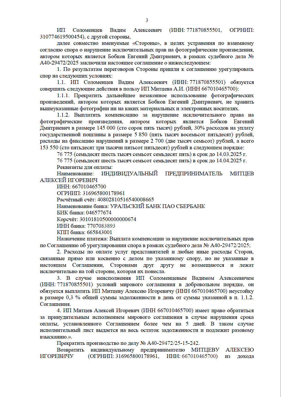 Юристы «Оригинального решения» выявили факт незаконного использования фотографий, автором которых является Евгений Бобков, индивидуальным предпринимателем Соломенцевым В.А.. Изначально мы обратились в Арбитражный суд города Москвы с иском на сумму 290 000 рублей, жестко обозначив свою позицию.