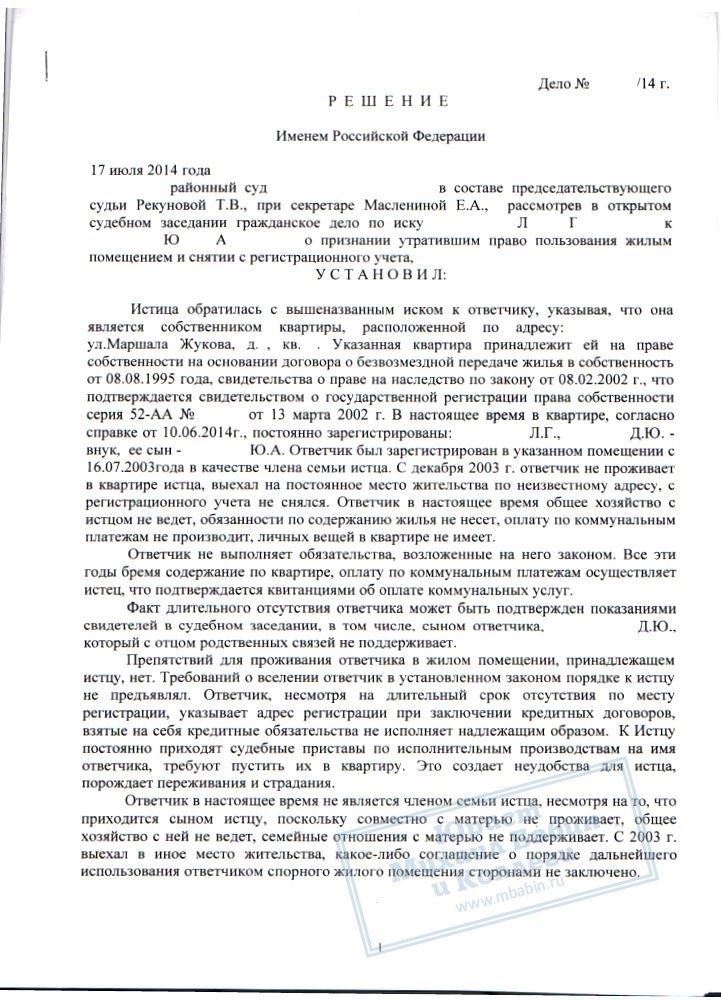 С помощью юриста нашей коллегии, нарушение закона было устранено, сын Б. признан прекратившим право пользования квартирой и выписан из нее.