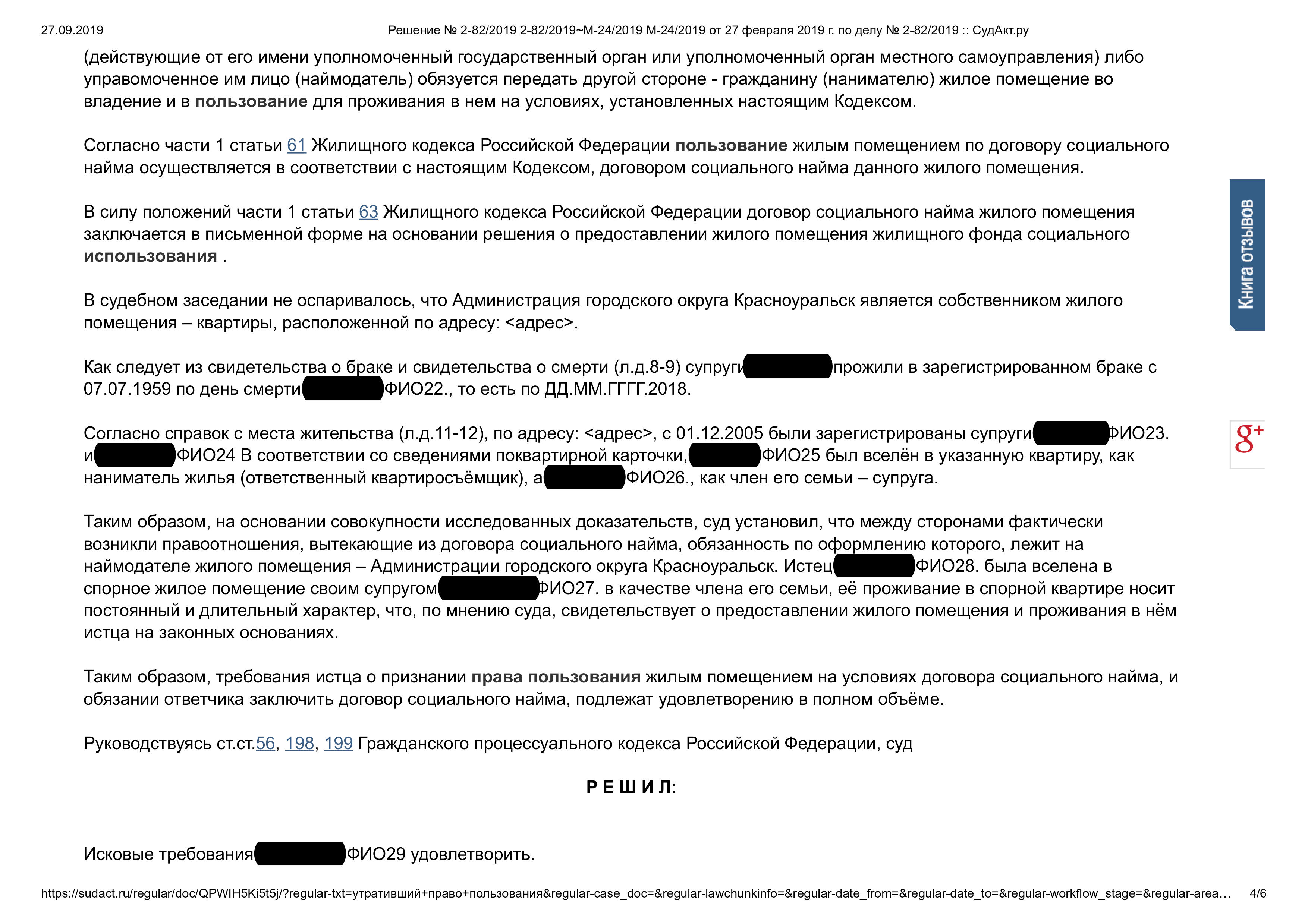 Суд решил: Признать за истцом право пользования жилым помещением – квартирой на условиях договора социального найма. Обязать Администрацию городского округа Красноуральск заключить договор социального найма с истцом на жилое помещение – квартиру.